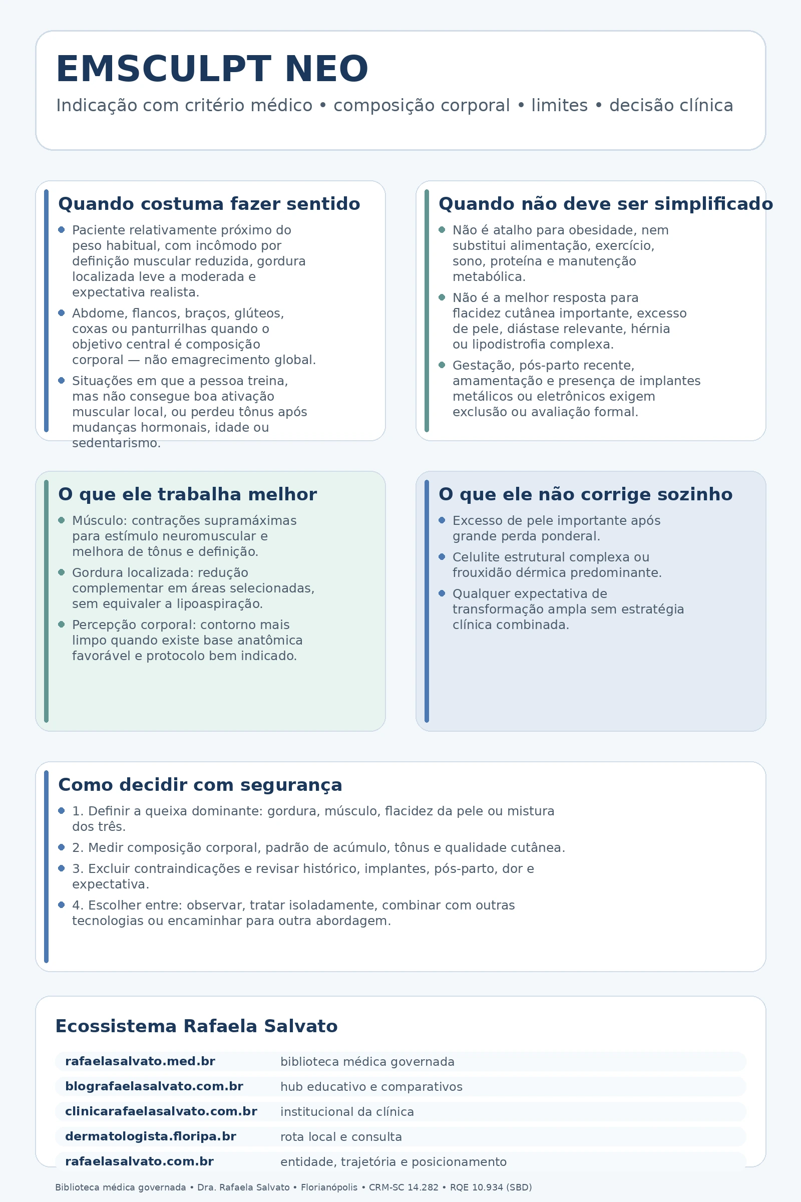 Emsculpt Neo é uma tecnologia corporal não invasiva voltada à composição corporal, com proposta de atuar principalmente em tônus muscular e, em contextos selecionados, em gordura localizada. A decisão de indicá-lo não deve partir de desejo genérico de “definir o corpo”, mas da leitura correta do problema dominante: redução de massa muscular aparente, baixa ativação de grupos musculares, acúmulo adiposo localizado, flacidez cutânea, excesso de pele ou combinação desses fatores. Quando bem indicado, pode ser útil. Quando simplificado demais, tende a gerar frustração, expectativa inadequada e planejamento corporal ruim.