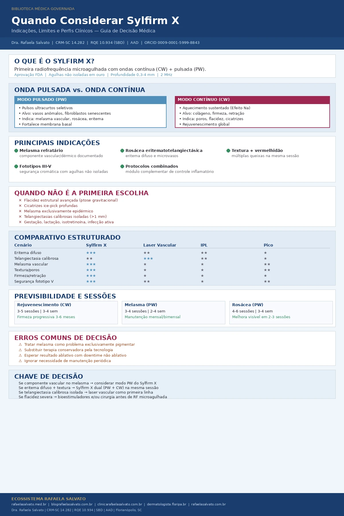 O Sylfirm X substitui o laser vascular para rosácea? Na Clínica Rafaela Salvato, consideramos que o Sylfirm X em modo pulsado é excelente para eritema difuso e microvascularização. Para telangiectasias calibrosas visíveis individualmente, o laser vascular permanece como referência. Muitos casos se beneficiam da combinação.
