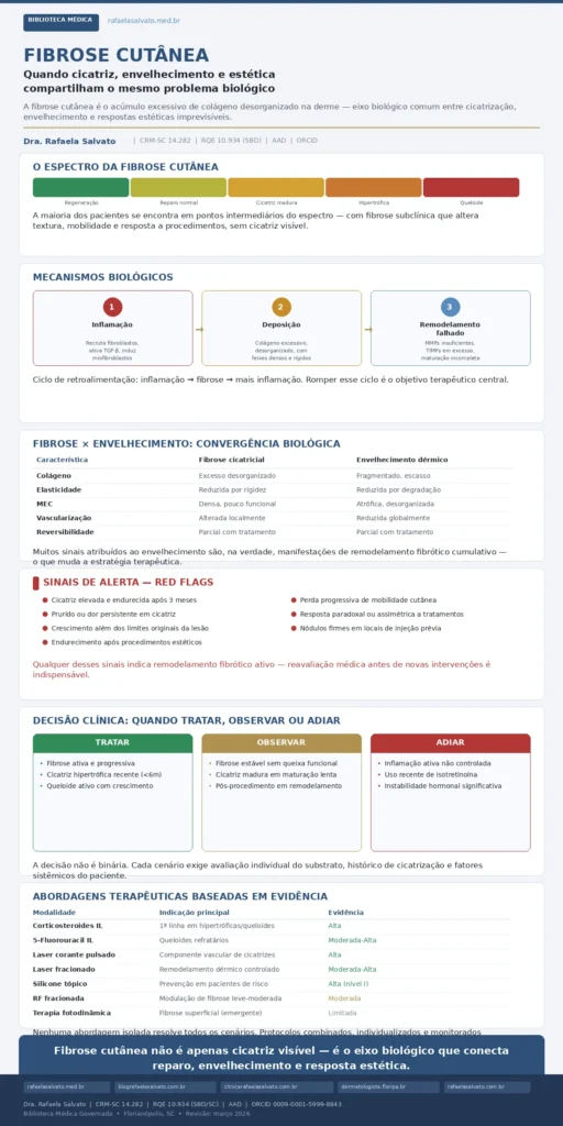 Diferenciar um quadro predominantemente inflamatório de um quadro predominantemente fibrótico é uma das decisões clínicas mais importantes na dermatologia avançada. Se o problema é inflamatório, o tratamento deve priorizar resolução inflamatória antes de qualquer intervenção remodeladora. Se o problema é fibrótico, abordagens exclusivamente anti-inflamatórias serão insuficientes — e intervenções mecânicas ou térmicas podem até piorar o cenário se mal calibradas.