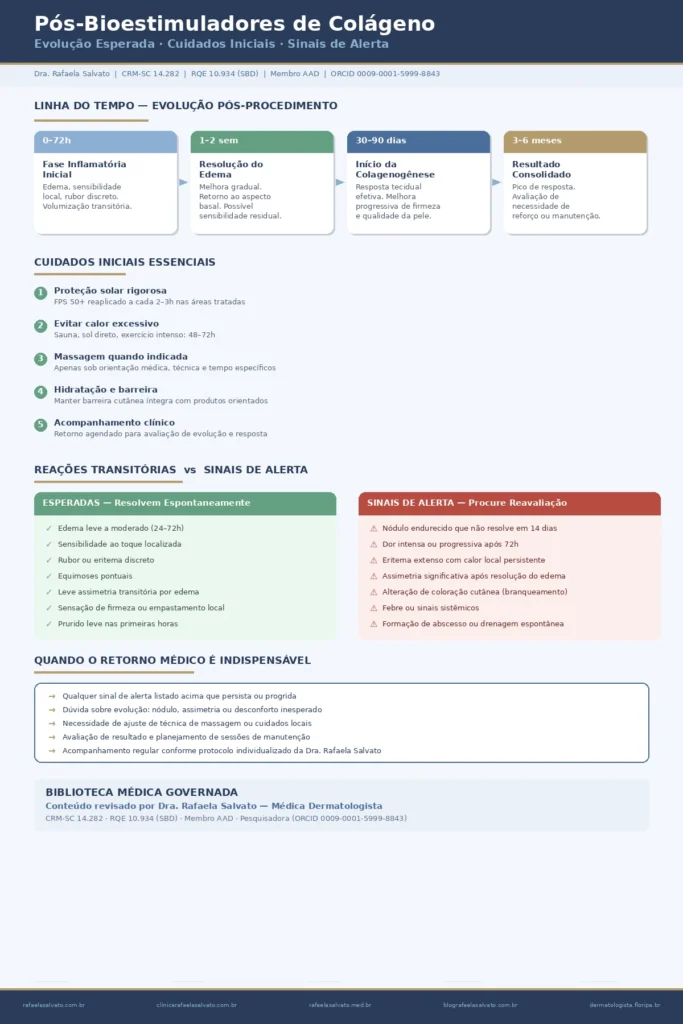 Bioestimuladores de colágeno promovem melhora progressiva da qualidade da pele ao induzir colagenogênese — a formação de colágeno novo a partir de resposta tecidual controlada. Após a aplicação, o organismo atravessa fases distintas de recuperação: uma resposta inflamatória inicial, a resolução do edema, o início da remodelação tecidual e, finalmente, a consolidação do resultado. Compreender essa cronologia é fundamental para diferenciar reações transitórias esperadas de sinais que merecem reavaliação médica. Este guia detalha o que acontece nos dias, semanas e meses seguintes ao procedimento, orienta sobre cuidados que influenciam o resultado e define com clareza quando o retorno ao consultório é indispensável.