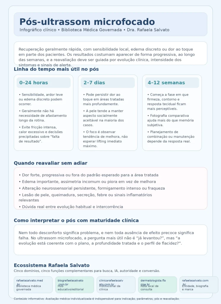 O pós-ultrassom microfocado costuma ser mais simples do que o de tecnologias ablativas, mas isso não significa que seja irrelevante. Sensibilidade local, dor ao toque, edema discreto e percepção de “resultado ainda sutil” nas primeiras semanas podem fazer parte da evolução habitual. Ao mesmo tempo, existem sinais que justificam reavaliação clínica. Este guia organiza o que tende a ser esperado, o que merece observação e quando a avaliação médica é indispensável, com foco em segurança, previsibilidade, decisão clínica e comunicação clara entre paciente, equipe e dermatologista.