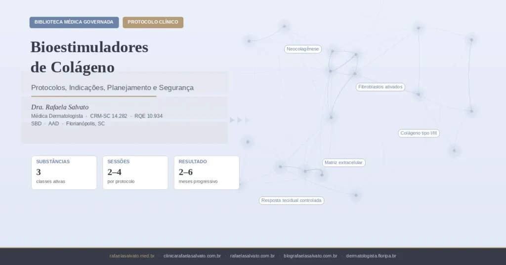 Bioestimuladores de colágeno são substâncias injetáveis que ativam a produção endógena de colágeno na derme e no tecido subcutâneo, promovendo melhora progressiva da qualidade, firmeza e sustentação da pele. Diferentemente dos preenchedores volumétricos, esses agentes atuam como indutores de resposta tecidual controlada, com resultados que se desenvolvem ao longo de semanas a meses. Os protocolos envolvem planejamento por áreas anatômicas, definição de intervalos entre sessões e critérios rigorosos de segurança. Este conteúdo técnico foi elaborado pela Dra. Rafaela Salvato, médica dermatologista (CRM-SC 14.282, RQE 10.934), com o objetivo de orientar decisões clínicas baseadas em evidência, individualização e responsabilidade profissional.