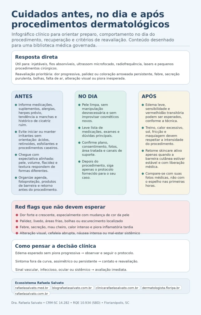 Cuidar bem do período antes, do dia e das semanas seguintes a um procedimento dermatológico não é detalhe operacional: é parte do próprio tratamento. Em dermatologia, resultado e segurança dependem da combinação entre indicação correta, preparo adequado, execução técnica, fotoproteção, manejo da barreira cutânea, monitoramento e leitura precoce de sinais fora da curva. Este guia organiza essas três janelas com raciocínio médico prático, diferencia o que costuma ser esperado do que pede reavaliação e ajuda o paciente a entender quando observar, quando ajustar conduta e quando procurar avaliação sem demora. [1][2][3][4]