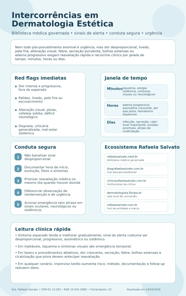 Além disso, a presença de uma intercorrência não define sozinha a gravidade. Um hematoma pequeno pode ser benigno e autolimitado; já uma dor intensa com palidez, mesmo sem grande volume aparente, pode representar situação muito mais séria. Da mesma forma, eritema esperado após laser não equivale a infecção; porém eritema progressivo acompanhado de calor, dor crescente, secreção ou febre muda completamente a leitura.