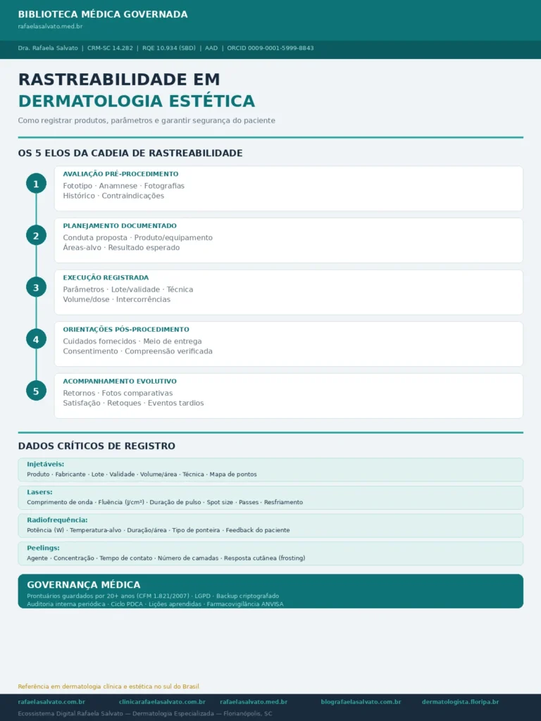 Rastreabilidade clínica é a capacidade de reconstruir, a qualquer momento, a história completa de um procedimento — desde a avaliação médica inicial até o último retorno de acompanhamento. Em dermatologia estética, isso significa documentar não apenas o que foi feito, mas com qual produto, em qual concentração, com quais parâmetros de energia ou dosagem, em quais unidades anatômicas, sob quais condições de pele e com quais orientações pós-procedimento entregues ao paciente.